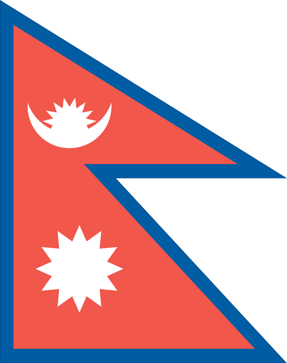 The National Flag of Nepal is unique in that it is the only national flag in the world not rectangular in shape. This distinctive flag consists of two juxtaposed triangular figures with a crimson base and deep blue borders. The upper part has a white emblem of the crescent moon with eight rays, while the lower one bears a twelve-rayed white emblem of the sun. .